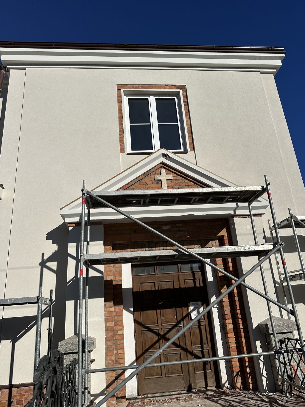 Zakres prac obejmował m.in.: generalny remont dachu, kompleksowy remont elewacji – oczyszczenie, uzupełnienie ubytków, wykonanie nowych tynków i malowanie – oraz pełne odnowienie wnętrz. Wykonaliśmy nowe instalacje, wymieniliśmy posadzki i stolarkę, zmodernizowaliśmy sanitariaty oraz inne pomieszczenia użytkowe. Przestrzenie zostały dostosowane do współczesnych standardów użytkowych, z zachowaniem estetyki budynku sakralnego.